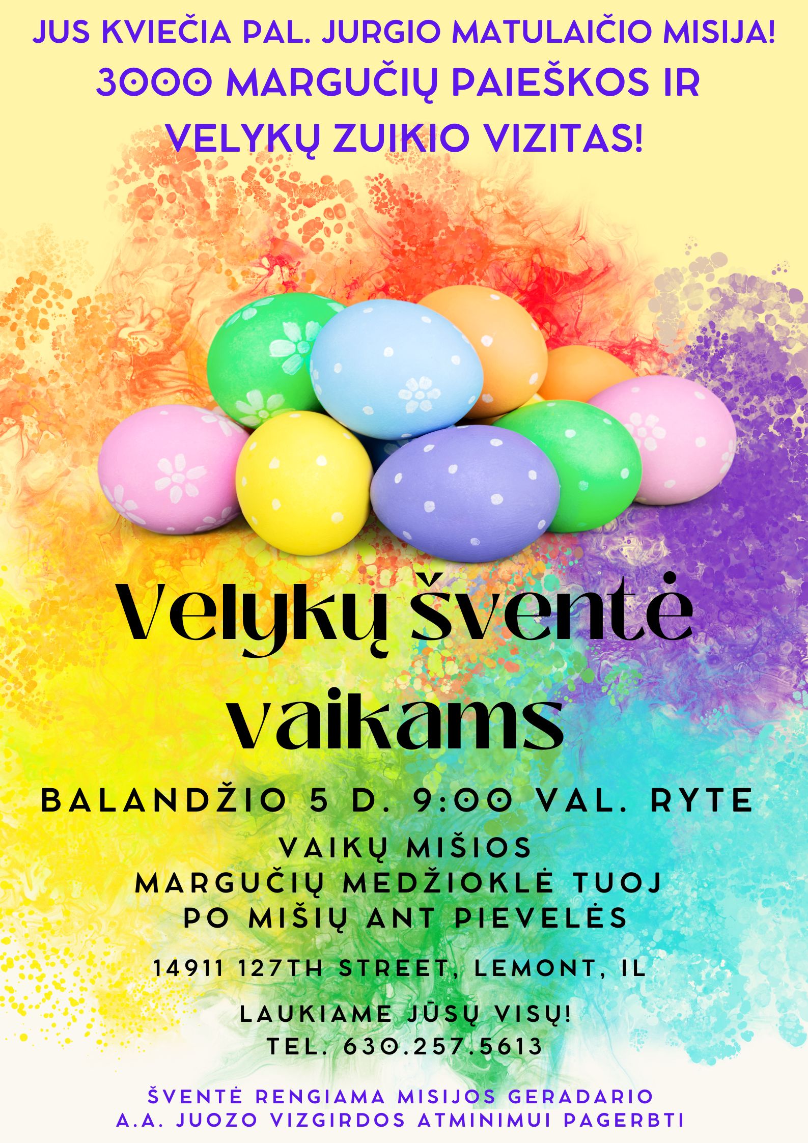 Tuoj po 9:00 v.r. Velykų sekmadienio šv. Mišių Palaimintojo Jurgio Matulaičio misijoje, kviečiame vaikus į smagias rungtis ir net 3,000 margučių paiešką. Jus net aplankys velykų zuikis! Šventė rengiama misijos geradarbio A. A. Juozo Vizgirdo atminimui pagerbti.