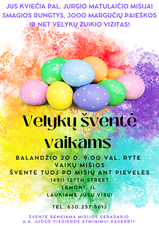 Tuoj po 9:00 v.r. šv. Mišių Palaimintojo Jurgio Matulaičio misijoje, kviečiame vaikus į smagias rungtis ir net 3,000 margučių paiešką. Jus net aplankys velykų zuikis! Šventė rengiama misijos geradarbio A. A. Juozo Vizgirdo atminimui pagerbti.