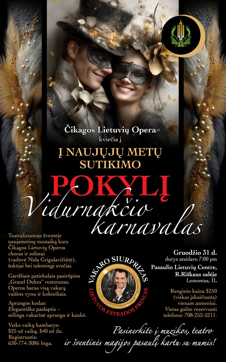 The Chicago Lithuanian Opera invites you to celebrate the New Year in style at Midnight Carnival — an elegant evening filled with music, artistry, and festive surprises. Enjoy live performances by opera singers and guest artists, including a special appearance by the Prince of Lithuanian Pop.