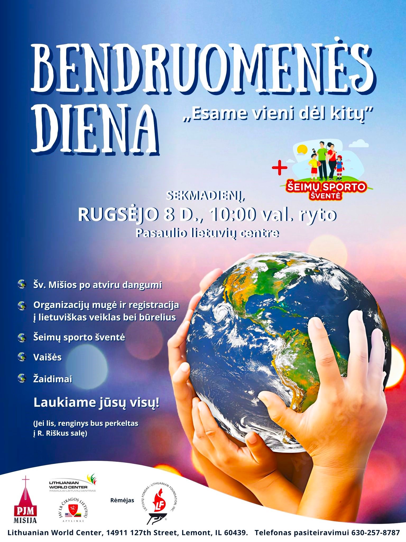 We invite everyone to the most beautiful community event of the year. This is the one day of the year for everyone to be together! There will be an outdoor Mass, an organization fair and registration for Lithuanian activities and clubs, a family sports festival, refreshments, games, and more. We invite all Lithuanian organizations to register immediately by email at [email protected] or [email protected]. For more information, call (630) 257-5613 or (630) 257-8787. We look forward to seeing you! (If it rains, the event will be moved to Riškus Hall).