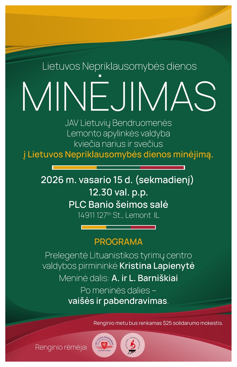 The LAC Lemont Chapter invites members and guests to celebrate Lithuanian Independence Day. The guest speaker will be Kristina Lapienytė, President of the Executive Committee of the Lithuanian Research and Studies Center. The artistic program will be performed by Ligita and Algimantas Barniškiai. Refreshments and fellowship will follow.