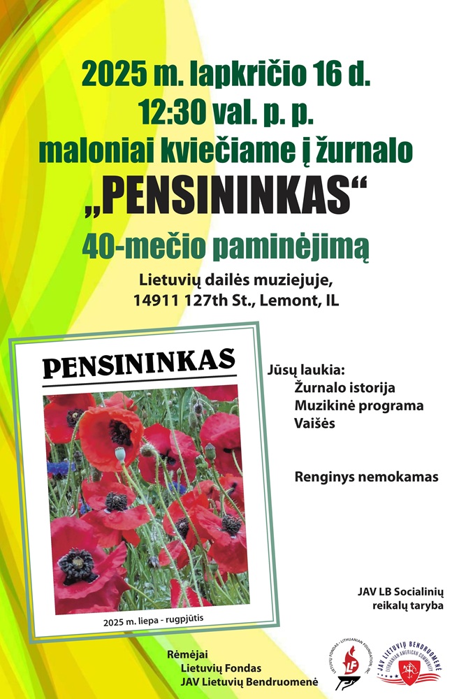Join us as we celebrate 40 years of “Pensininkas” magazine! Enjoy a presentation on the magazine’s history, a musical program, and light refreshments. Admission is free.