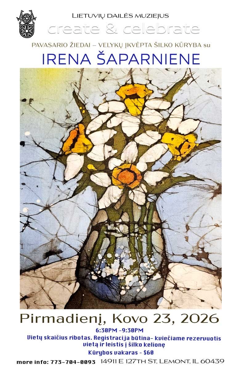 Kiekvienas dalyvis išsineš savo sukurtą darbą – pavasario nuotaiką, įamžintą šilke. Dirbtuvių kaina: $60. Vietų skaičius ribotas. Registracija: (773) 704-0093.