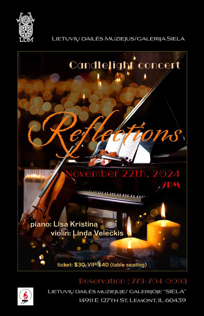 The Lithuanian Museum of Art invites you to an evening featuring performances by Lisa Kristina (piano) and Linda Veleckis (violin). Tickets are $30, or $40 for VIP seating (at tables). Reservations: (773) 704-0093.