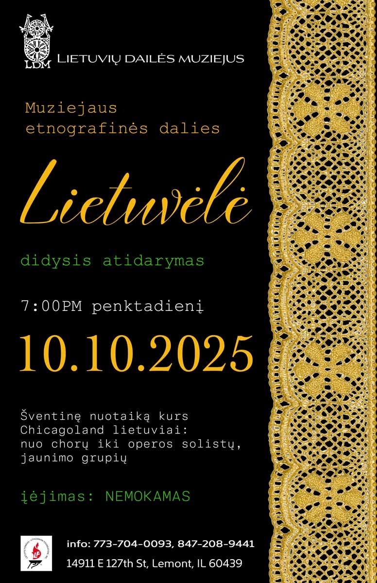 Jei tau brangi mūsų kultūra – šis vakaras skirtas tau! Kviečiame į iškilmingą naujų muziejaus erdvių „Lietuvėlė“ atidarymą! Tai ne tik unikali proga pabūti drauge, pasivaišinti ir švęsti – tai šventė, skirta draugystei ir bendrystei, kurią jaučiame būdami kartu. Bendrystei, kuri mus jungia per lietuvišką kultūrą ir tradicijas. Šventinę atmosferą kurs Chicagoland lietuvių atlikėjai – nuo choro balsų iki operos solistų ir jaunimo grupių.