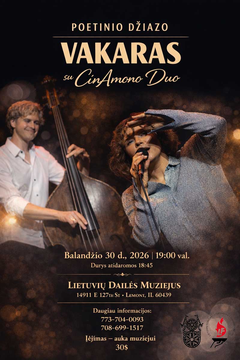 This program features selections from their 2024 album “Duo,” where original music is interwoven with poetry by Lithuanian writers—from Vytautas Mačernis and Salomėja Nėris to Jonas Mekas. The result is a beautifully layered experience that brings Lithuanian poetry to life through jazz.
