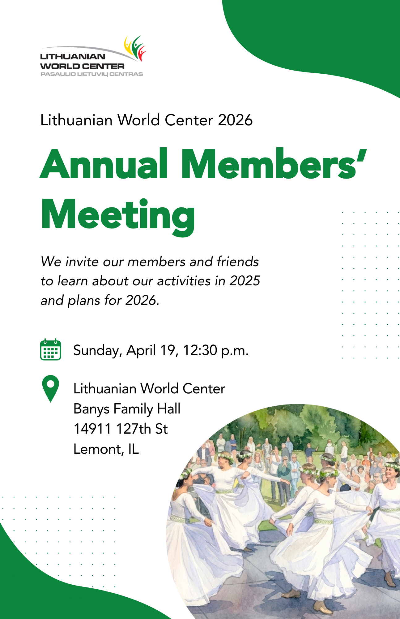 Members, friends, and guests are invited to attend and learn more about the Lithuanian World Center’s activities in 2025 and plans for 2026.
