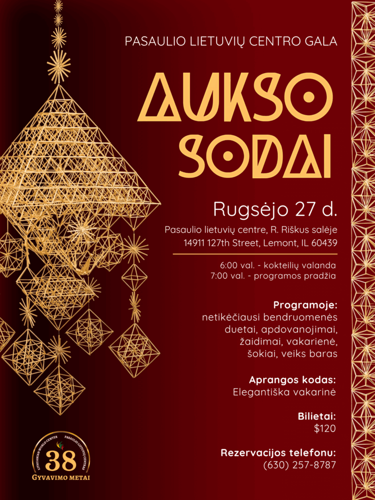 On September 27, the Lithuanian World Center will celebrate 38 years of serving the Lithuanian American community. This year, we invite you to join us in celebrating our shared success and looking ahead to the future by attending our 38th birthday gala, “Aukso sodai” (Golden Straw Gardens)!