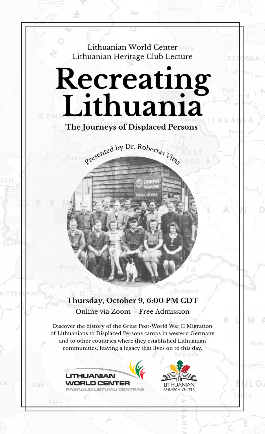 The Lithuanian World Center continues its mission of helping you explore and connect with your Lithuanian roots. Join us for an English-language lecture tracing the journeys of Lithuanian Displaced Persons at the end of World War II.