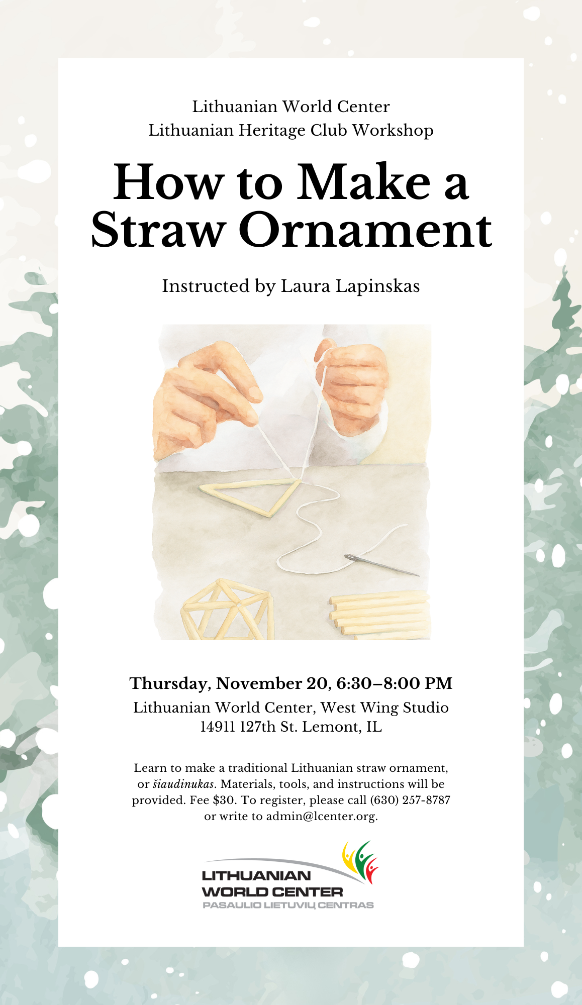 Lithuanian straw ornaments, or šiaudinukai, are made from straws that are threaded or tied together into geometric shapes such as stars, pyramids, and other three-dimensional forms, reflecting patterns found throughout Lithuanian folk art and nature. Šiaudinukai have traditionally been used to decorate Lithuanian homes, especially during winter and holiday seasons when fresh flowers were unavailable. We invite you to participate in this age-old tradition by making your own šiaudinukas at our workshop “How to Make a Straw Ornament” on Thursday, November 20, at the Lithuanian World Center in Lemont, IL. This beginner-level workshop guides participants in creating one paper straw ornament following a recommended design. Materials, tools, and instructions will be provided.