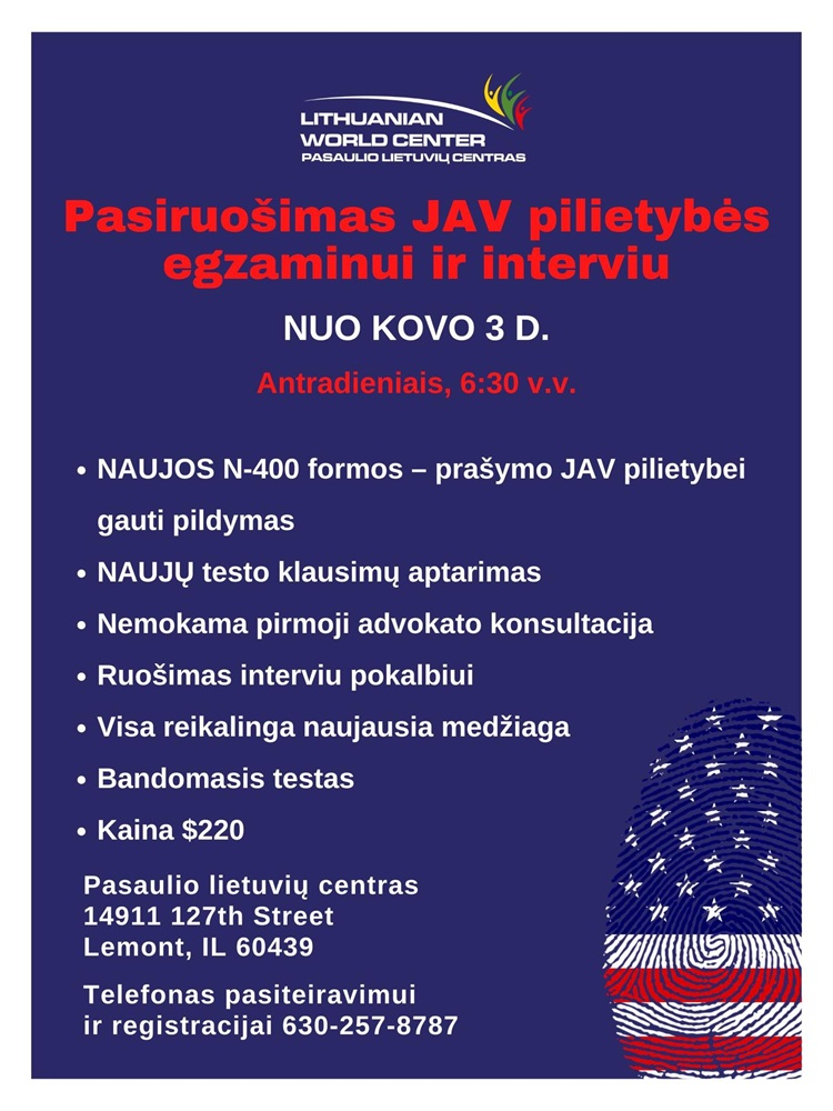 Planuojančius įgyti JAV pilietybę, kviečiame lankyti Pasaulio lietuvių centre vyksiančius pasiruošimo JAV pilietybės egzaminui kursus! Pamokų metu Jūs: užsipildysite formą JAV pilietybės egzaminui laikyti; su lektore išsinagrinėsite klausimus, užduodamus egzamino metu; susitiksite su advokate, kuri konsultuos Jums rūpimais klausimais; pasiruošite interviu. Kursų kaina – $220. Susidomėjusius kviečiame registruotis tel. (630) 257-8787.